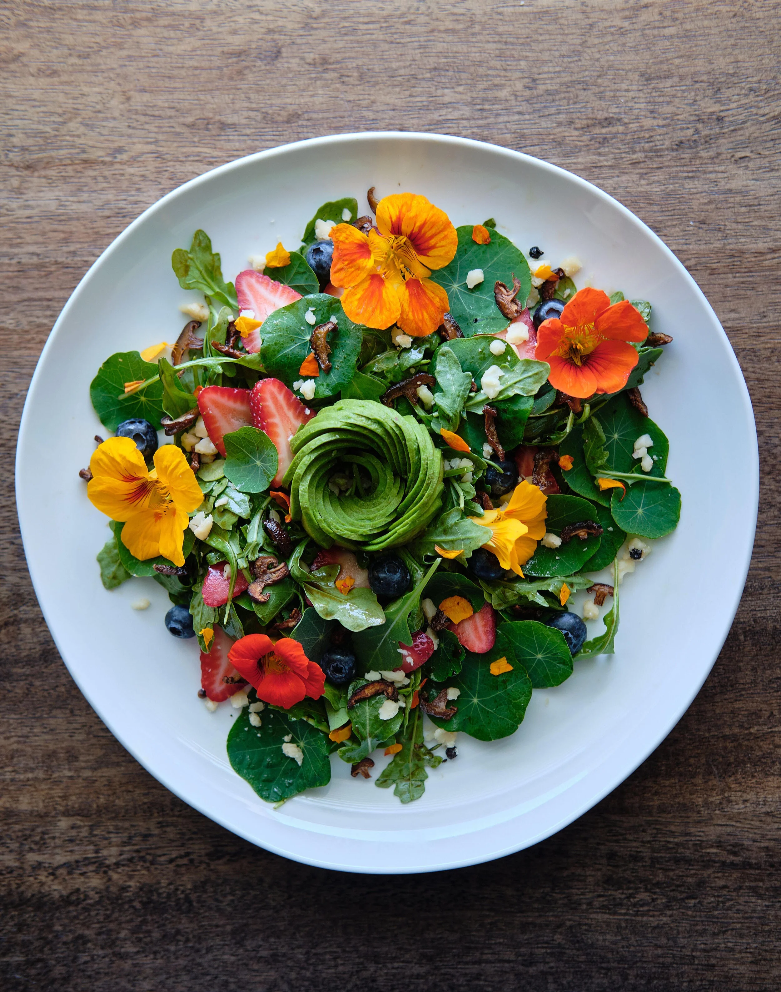 *Edible flowers can be added to this salad for an extra pop of color and nutrition. Most grocery stores carry these in the produce section. We used nasturtium leaves and flowers for this recipe*